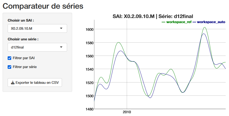 In light of the (bad) diagnostics, identified in particular through the quality report, the producer can intervene to modify the parameters and improve the statistical quality of the adjustment. For example, they can modify a set of calendar regressors and eliminate the residual calendar effects that they had previously observed. Beyond improving statistical test results, it is often useful to visualize the numerical impact of a parameter change or re-estimation, which allows revisions to be quantified and visualized, but also certain settings to be validated, particularly the choice of outliers based on “expert knowledge.” Exporting the series produced is one solution, but if you want to make these comparisons before you have finished working on a workspace, you can use the compare() 🔗 function from the rjd3production package, which avoids generating intermediate outputs. This allows you to read the series directly in two or more workspaces, each corresponding to a version of the parameters or a state of the estimate, as shown in the following code: